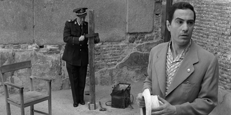 Tras la excelencia alcanzada con Plácido y la fría acogida de la obra episódica Las cuatro verdades, pocas personas podrían imaginar que la siguiente película de Berlanga se convertiría en uno de los films más referenciados y venerados de su filmografía, y en consecuencia, de la historia del cine español. El verdugo es un alegato contra la pena de muerte y el poder del sistema para absorber la voluntad y los valores del individuo. Otro óleo repleto de detalles que analiza la idiosincrasia del carácter patrio, con un punto de vista ácido, tierno y áspero. La conjunción formada por Luis García Berlanga, Rafael Azcona y Ennio Flaiano al guión, alcanza la perfección planteando diálogos y situaciones incómodas, pero a su vez, de tremenda comicidad, forjando un camino hacia una tragedia final más que esperada, pero no por ello menos impactante. El constante uso de la elipsis a lo largo del metraje avanza la trama al mismo ritmo vertiginoso de los diálogos a los que nos tiene acostumbrados el director. Sin duda, la obra formalmente más elegante de Berlanga, con un uso magnífico de la profundidad de campo, los planos secuencia y con escenas que se graban en la memoria, por mencionar dos de ellas: el juego de sombras con la Guardia Civil en la «cova del drac» de Mallorca o la secuencia del del patio de la cárcel con esa perfecta contraposición del verdugo y su victima, en dos estados anímicos opuestos y antónimos a su deber. El dúo actoral formado por Pepe Isbert, como el viejo verdugo que se retira, y Nino Manfredi, el joven yerno trabajador de pompas fúnebres que coge el relevo en el garrote vil, está espléndido, consiguiendo transmitir una veracidad y una empatia hacia sus vivencias y valores personales que hacen que se nos remueva algo por dentro al plantearnos el dilema con el que juega la película: ¿Aceptaríamos las ventajas de una vida mejor a cambio de realizar un acto que va en contra de nuestra ética personal? La rendición del hombre contemporáneo frente a los placeres del bienestar, aderezado con los rancios valores del deber y el patriotismo Franquista.