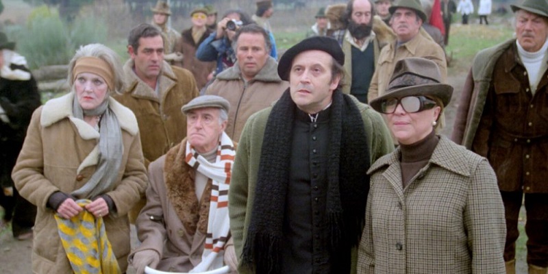 La bondad mostrada en ciertos personajes de las anteriores obras de Berlanga desaparece por completo en la caricaturesca y sarcástica La escopeta nacional. La propuesta coral por excelencia de su filmografía, en la que los conocidos como poderes fácticos de la época (y lamentablemente, de todas las épocas) se convierten en puros arquetipos de los defectos patrios: el empresario catalán que busca influencia política a toda costa para mejorar el negocio, los aristócratas venidos a menos con graves problemas económicos pero que siguen conservando su afán de poder, el sacerdote mal hablado y agresivo que siempre permanece al lado del Sol que más brilla, el cargo político que usa (y abusa) de su poder para conseguir beneficio propio, y un largo etcétera de acertados retratos de las miserias de las clases pudientes y de los decadentes y descarados tráficos de influencias de la época Franquista. Los elaborados e interminables planos secuencias van acompañados por historias cruzadas de múltiples personajes en frenéticos y constantes diálogos. Del reparto coral destaca el personaje del marqués de Leguineche, encarnado a la perfección por Luis Escobar Kirkpatrick, un lamentable aristócrata venido a menos con una particular afición, que resulta tan odioso y atractivo que ha protagonizado las dos secuelas de la película, e inferiores a la original: Patromonio nacional y Nacional III. Visión satírica del fin de una era, de una época en la que unas clases privilegiadas se removían para mantener esos privilegios, a toda costa, aunque eso suponga traicionar sus propios principios o cambiar posicionamientos en los que anteriormente se habían mantenido firmes. Los santos inocentes, obra de Miguel Delibes que adapta al cine Mario Camus, realiza un retrato trágico de una familia de campesinos que es explotada por un terrateniente. La escopeta nacional usa el sarcasmo y la comedia para describir a esos mismos terratenientes y sus aliados próximos. Pese a las diferencias de tono y mensaje, se retrata la misma mezquindad.